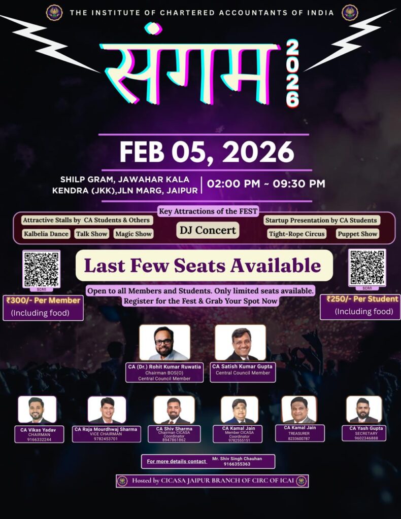 CA Students Youth Fest on Thursday, 5 February 2026 at Jawahar Kala Kendra Shilpgram Jaipur (Timing 2PM to 10 PM)
