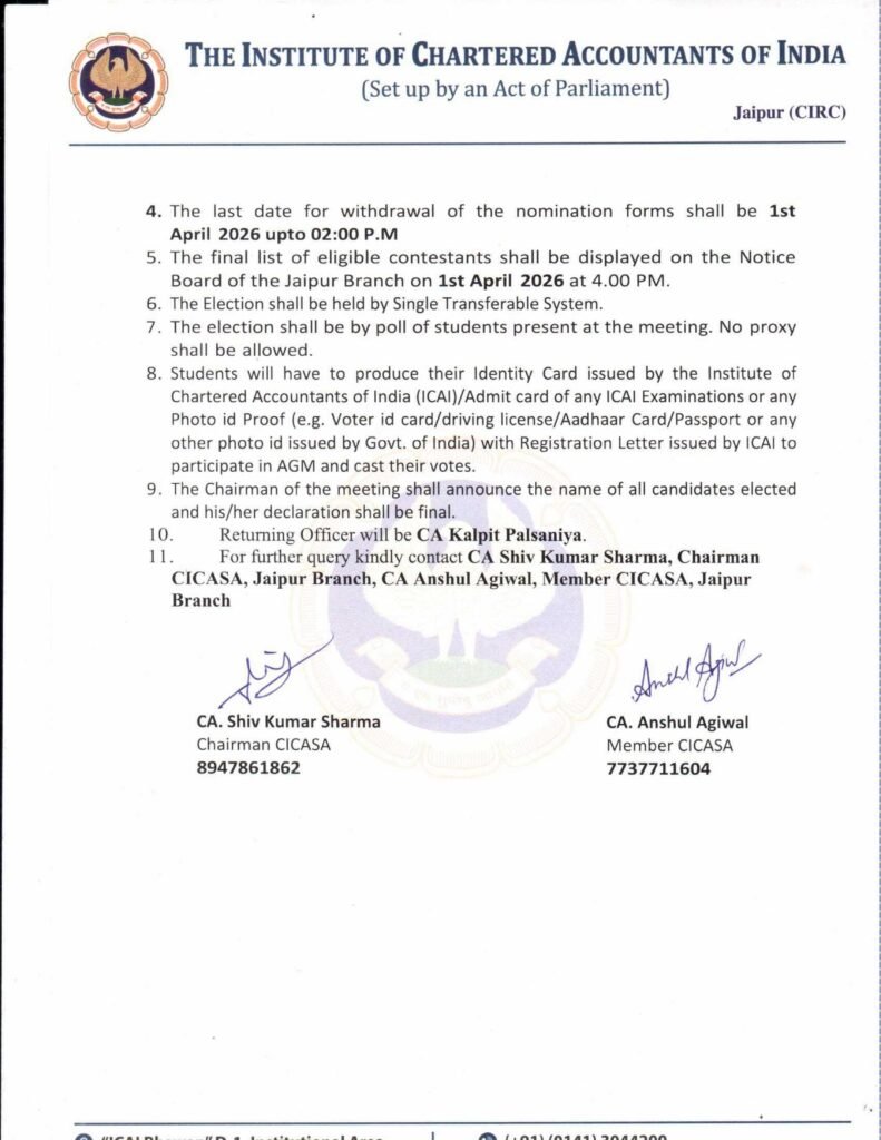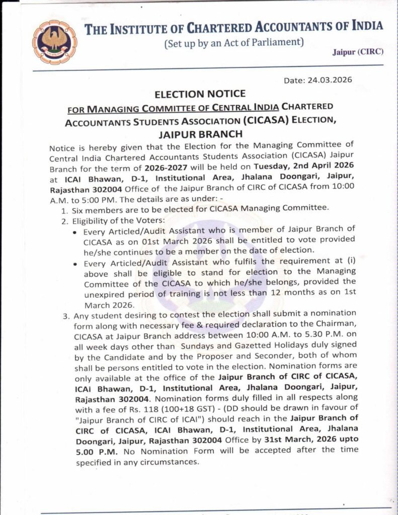 CICASA Jaipur Branch Election Notice for the term of 2026-2027