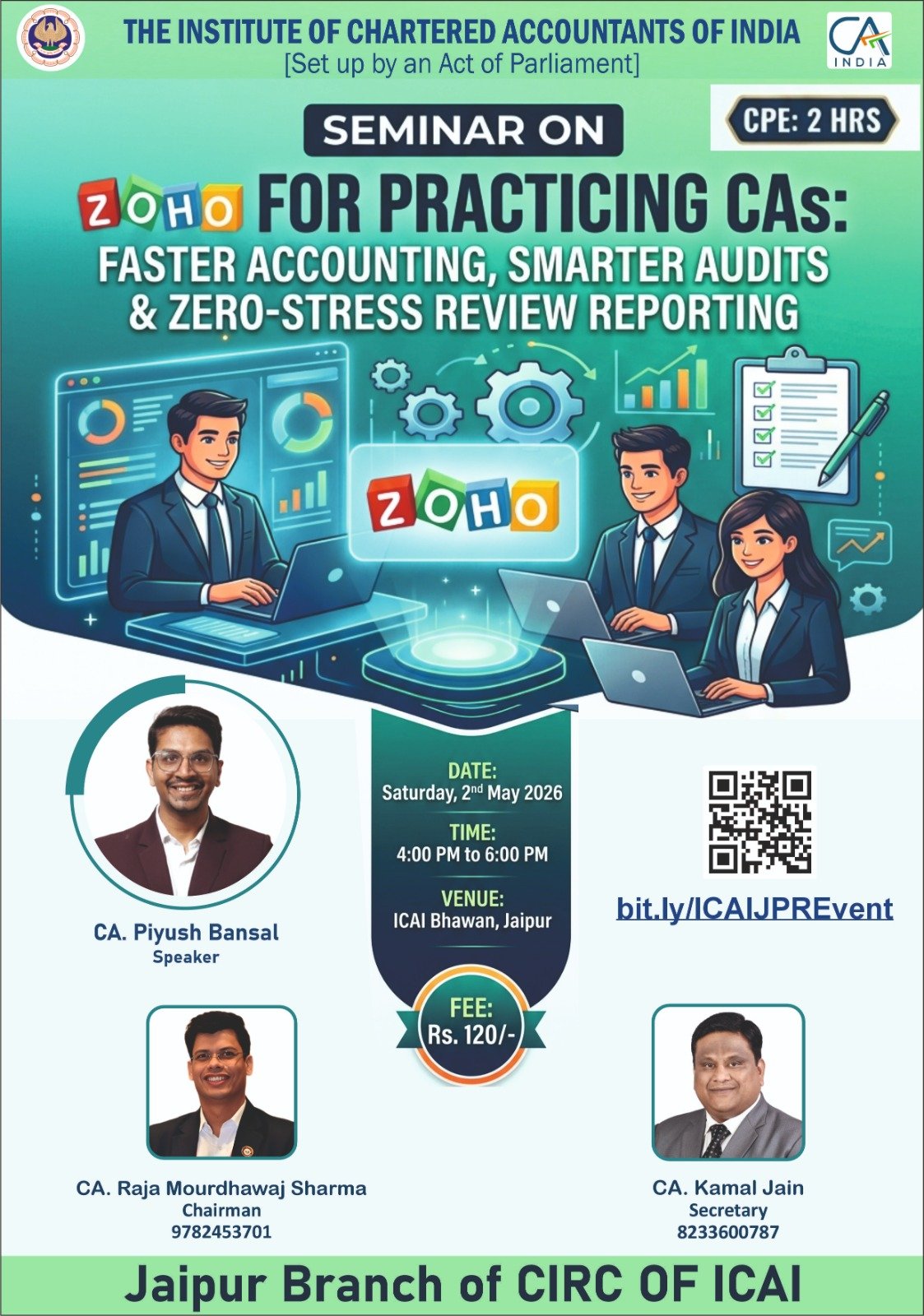2 CPE Hrs. Seminar on Zoho for Practicing CAs: Faster Accounting, Smarter Audits & Zero-Stress Review Reporting on 2 May 2026 from 4:00PM-6:00PM at ICAI Bhawan, Jaipur
