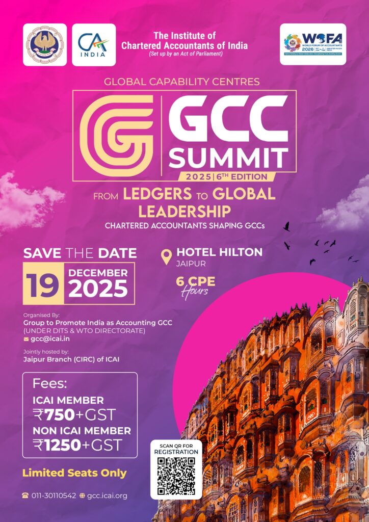 GCC Summit for Non ICAI Member on 19 December 2025 at Hotel Hilton Jaipur Fee Rs. 750/- + GST for ICAI Member, Rs. 1250/- + GST Non ICAI Members.